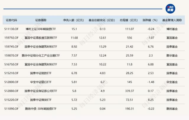 據(jù)Wind數(shù)據(jù)顯示,在7月22日的非貨幣ETF市場(chǎng)中,博時(shí)上證30年期國(guó)債ETF份額增加了0.13億份,凈流入額高達(dá)15.1億元;富國(guó)中證港股通互聯(lián)網(wǎng)ETF份額增加12.61億份,凈流入額為11.68億元;國(guó)泰中證全指建筑材料ETF份額增加13.29億份,凈流入額為8.92億元。