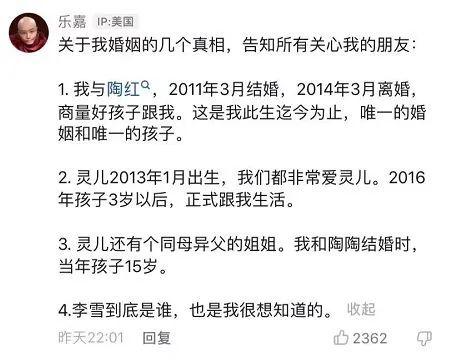 樂嘉在某社交平臺(tái)公開表示,他與陶紅于2011年3月結(jié)婚,生下女兒靈兒1年后,于2014年3月離婚。陶紅是他此生唯一的妻子,靈兒是他唯一的孩子。對(duì)于所謂的現(xiàn)任妻子李雪,樂嘉也表示自己很想知道“李雪到底是誰”。