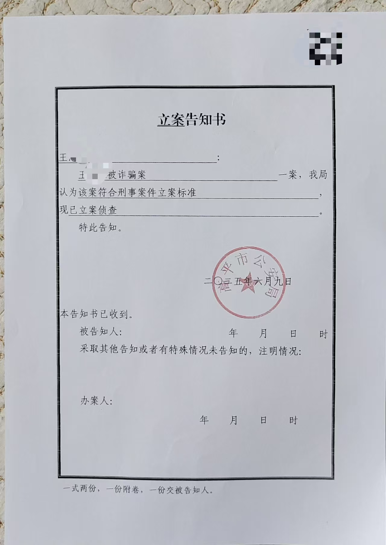 王先生提供的受案回執(zhí)單顯示,6月5日高平市公安局已受理他的被詐騙案,“立案告知書”顯示6月9日已立案偵查。