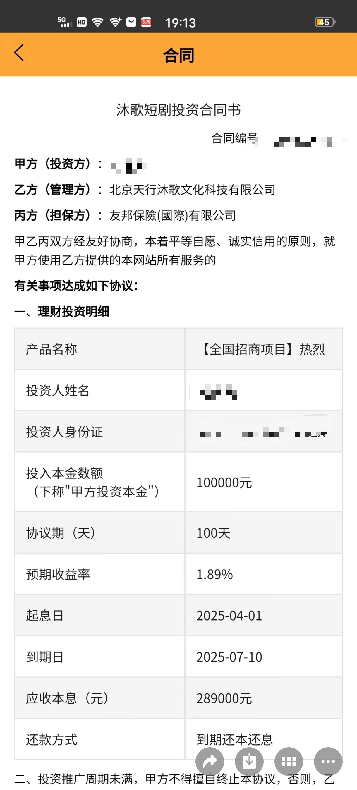 之后,他又認(rèn)購十余個項目,轉(zhuǎn)賬金額從200元到3萬元不等。4月1日,他看到“【全國招商項目】熱烈”項目,宣稱成為區(qū)域代理可享政策紅利,每周一領(lǐng)1588元財政補(bǔ)貼,持續(xù)五年。他認(rèn)為成為區(qū)域代理更保險,便用妻子信息投入10萬元,起息日4月1日,到期日7月10日,協(xié)議期100天。轉(zhuǎn)賬后平臺有《沐歌短劇投資合同書》,顯示他妻子是投資方,“北京天行沐歌文化科技有限公司”為管理者,投入的10萬元100天后本息可得28.9萬元。