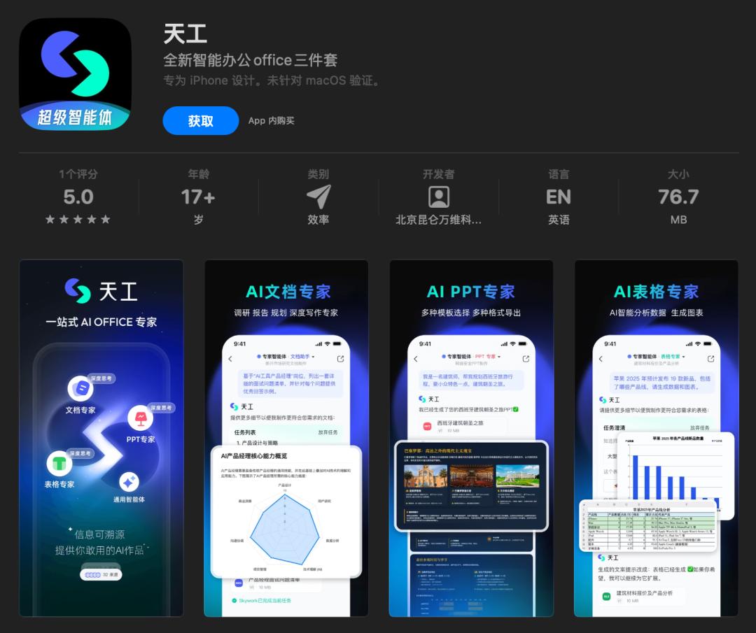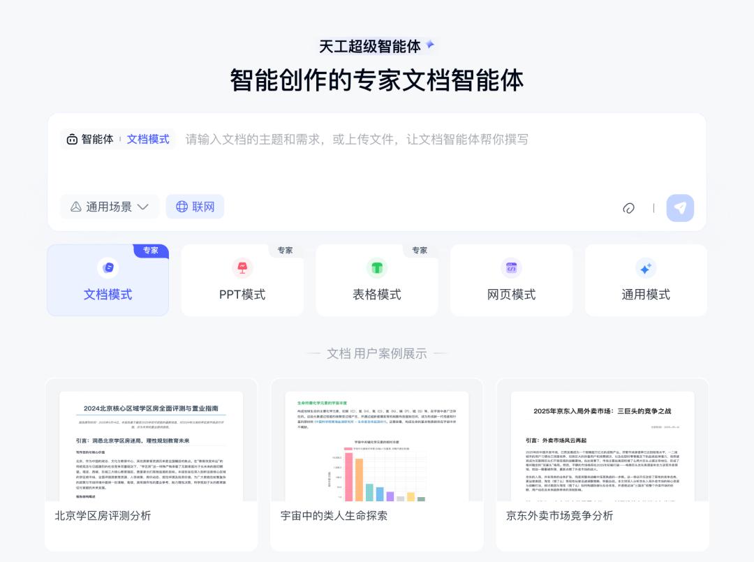 今年5月,昆侖萬維完成了戰(zhàn)略轉(zhuǎn)型。先是停止天工全能AI搜索助手的維護(hù),隨后在5月高調(diào)推出天工超級智能體,集成文檔、表格、PPT、網(wǎng)頁等多個智能Agent,正式打出「AI版Office」的旗號。