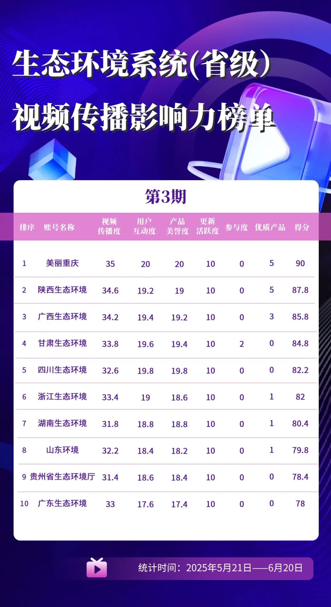 為推動生態(tài)環(huán)境系統(tǒng)提升短視頻制作與運營水平,鼓勵地方運用短視頻宣傳,產(chǎn)出高質量、有影響力的作品,在中國環(huán)境報社、中國環(huán)境客戶端,于生態(tài)環(huán)境部宣傳教育司的指導下,發(fā)布了生態(tài)環(huán)境系統(tǒng)(省級)視頻號傳播影響力榜單。在此次榜單中,“甘肅生態(tài)環(huán)境”視頻號表現(xiàn)出色,綜合得分84.8,位居第四!