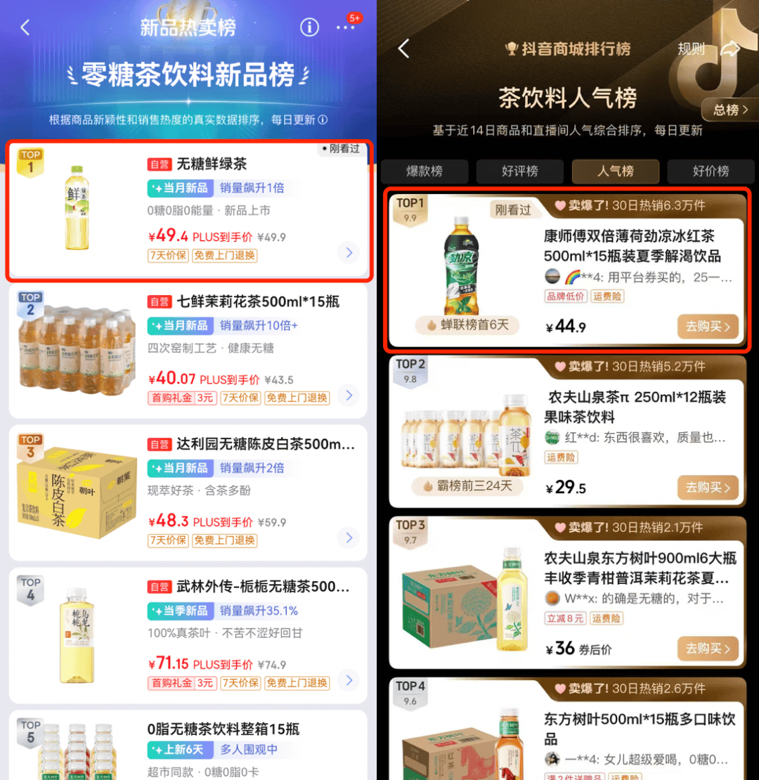 實際上,飲料行業(yè)并不缺乏新品。然而,「子彈財經(jīng)」注意到,作為飲品巨頭的康師傅,今年上半年的新品矩陣呈現(xiàn)出一個值得深入探究的現(xiàn)象:在行業(yè)新品存活率不斷降低的情況下,康師傅推出的多款新品都取得了不俗的成績。例如,鮮綠茶登上了京東零糖茶飲料新品榜榜首,雙倍薄荷勁涼冰紅茶在抖音茶飲料人氣榜和新品榜中排名第一。這種強大的市場穿透力引發(fā)了「子彈財經(jīng)」的興趣,我們深入剖析了其背后的創(chuàng)新邏輯。