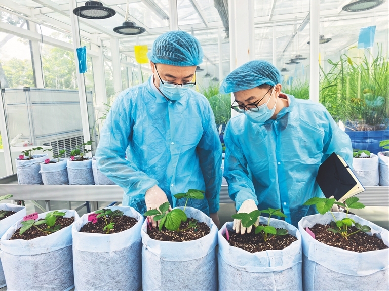 在三亞月亮島,科研人員正在查看草莓苗的長勢。