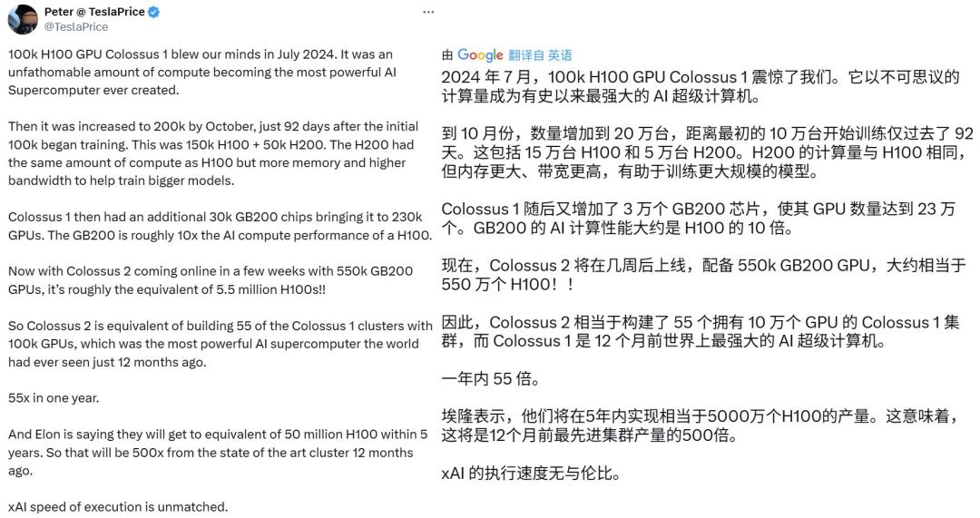 有網(wǎng)友做了簡(jiǎn)單的盤點(diǎn)和計(jì)算:配備55萬(wàn)塊GB200的Colossus 2大約相當(dāng)于550萬(wàn)H100,是一年前Colossus 1的55倍