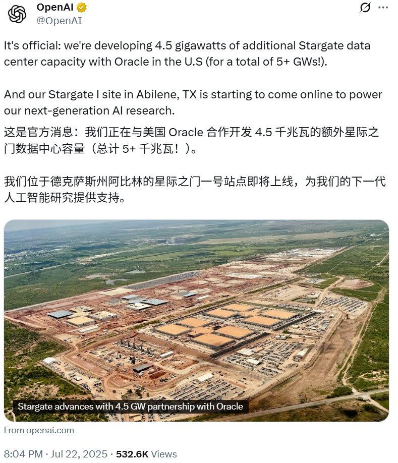 或許正是為了回應(yīng)這個(gè)報(bào)道,OpenAI公布了星際之門計(jì)劃的新進(jìn)展:OpenAI正式宣布正與甲骨文(Oracle)在美國(guó)合作開(kāi)發(fā)另外4.5 GW的星際之門數(shù)據(jù)中心容量。