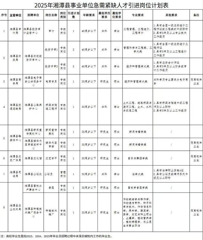 此次計(jì)劃引進(jìn)急需緊缺專業(yè)人才的單位有湘潭縣審計(jì)局、財(cái)政局、商務(wù)局、交通運(yùn)輸局、融媒體中心、文旅廣體局、司法局、農(nóng)業(yè)農(nóng)村局等8家。崗位涵蓋審計(jì)、投資評審、電商專員、橋梁與隧道工程師、新聞宣傳策劃等,要求報(bào)考人員最低學(xué)歷為本科生或研究生。其中有4個(gè)崗位限制高校畢業(yè)生報(bào)考(指2023、2024、2025年畢業(yè)且招聘過程中未落實(shí)編制內(nèi)工作的畢業(yè)生,不考慮其是否有工作經(jīng)歷、繳納社保情況)。若引進(jìn)崗位要求有工作經(jīng)歷,報(bào)考人員必須具備相應(yīng)經(jīng)歷。工作經(jīng)歷包括在各級黨政機(jī)關(guān)、各類企事業(yè)單位、村(社區(qū))組織、其他經(jīng)濟(jì)組織、社會(huì)組織等工作以及自主創(chuàng)業(yè)的經(jīng)歷;離校未就業(yè)高校畢業(yè)生到高校畢業(yè)生實(shí)習(xí)見習(xí)基地參加見習(xí)或者到企事業(yè)單位參與項(xiàng)目研究的經(jīng)歷;軍隊(duì)工作經(jīng)歷。全日制高校畢業(yè)生在校期間參加社會(huì)實(shí)踐、實(shí)習(xí)、兼職等經(jīng)歷不能視為工作經(jīng)歷。工作經(jīng)歷計(jì)算時(shí)間截至2025年7月31日,年限按足年足月計(jì)算。