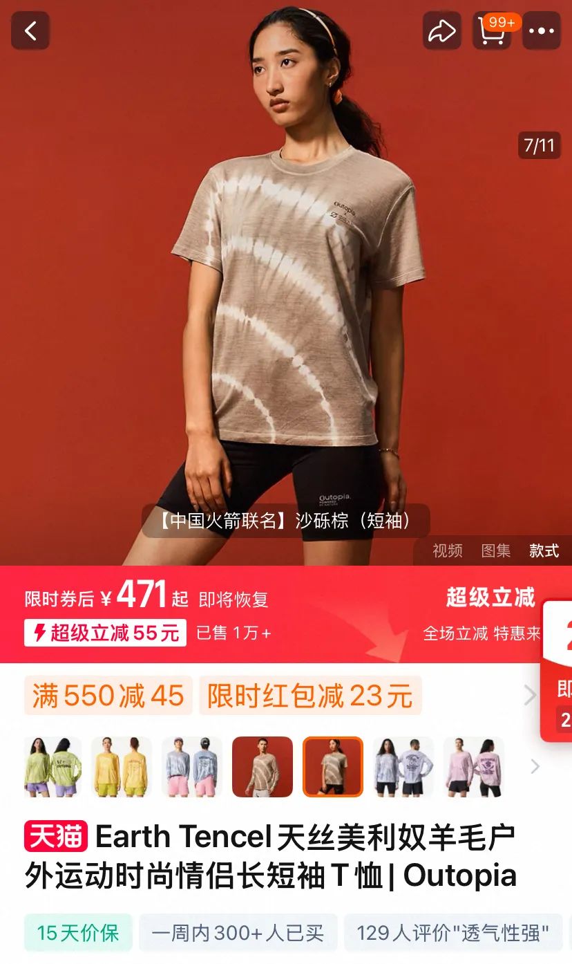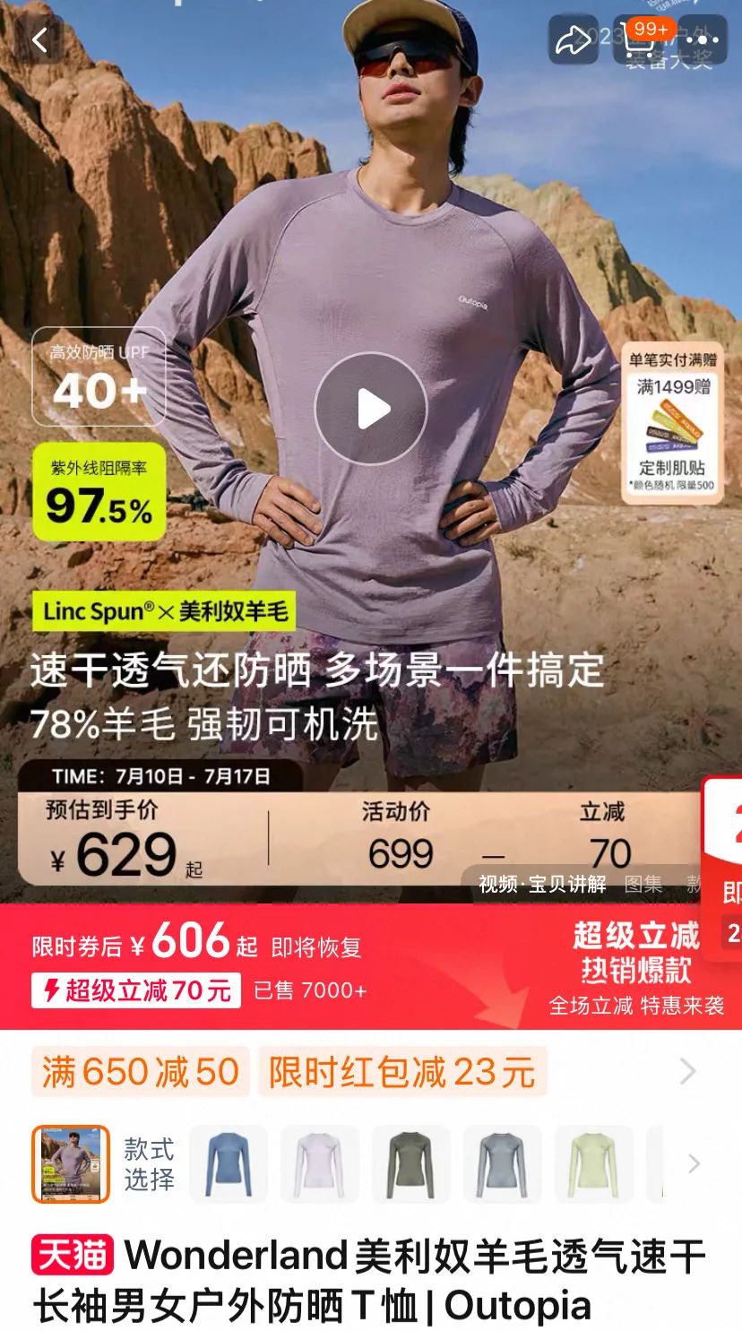 新銳品牌outopia 2021年成立,主打羊毛面料,去年“618”拿下天貓速干背心、皮膚衣兩個(gè)細(xì)分類目第一。其天貓旗艦店一款六百元出頭、標(biāo)注“78%羊毛”的戶外防曬T恤,單鏈接售出7000+,歷史成交超2萬(wàn)單。