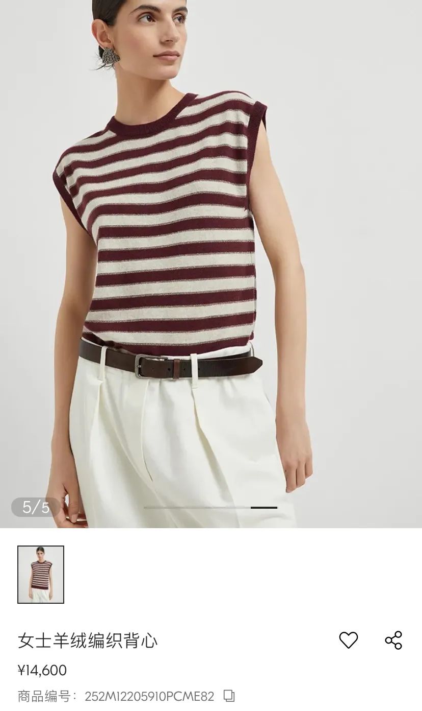 同樣走靜奢路線的Brunello Cucinelli,鐘情于“金羊毛”亞洲絨山羊,其羊絨編織條紋背心以中性色調(diào)和隱形logo設(shè)計(jì),盡顯“低調(diào)奢華”。