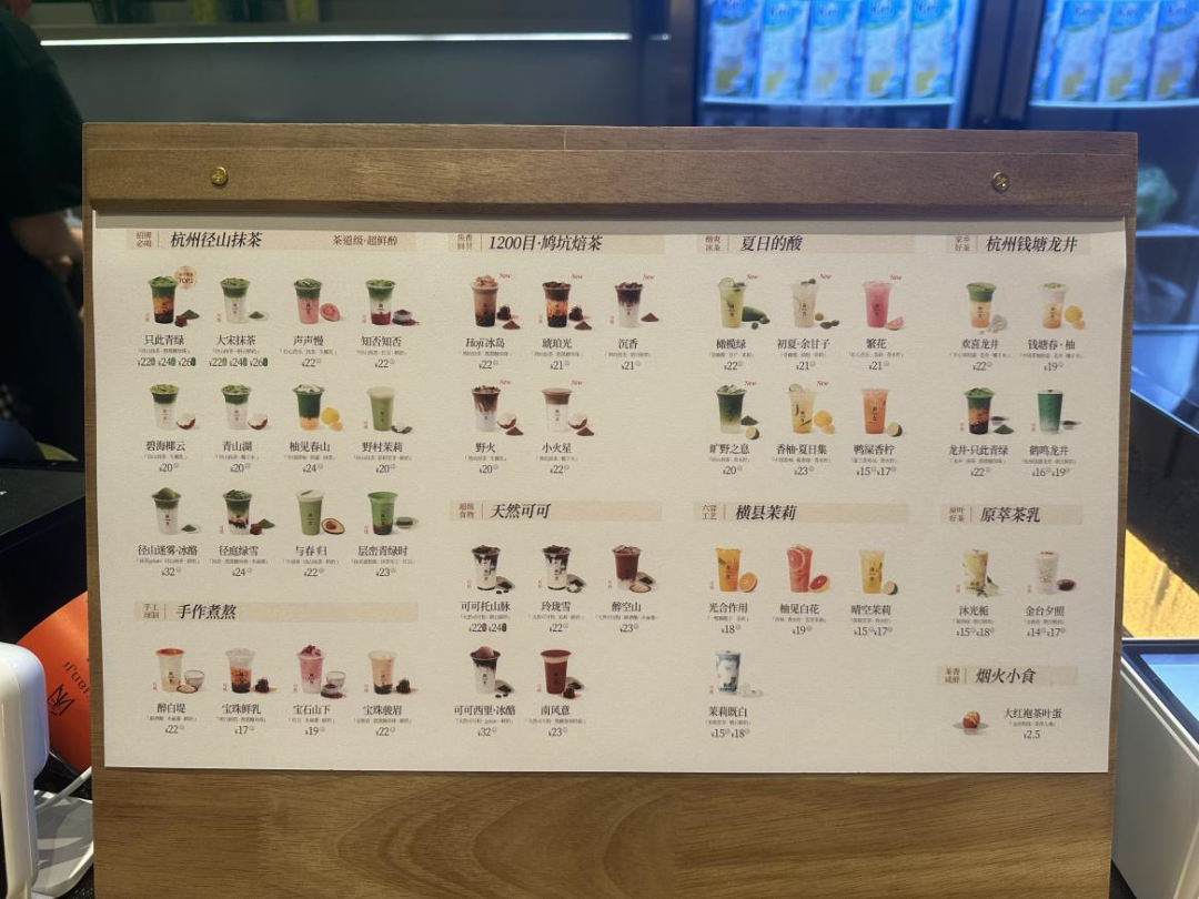 菜單上有42款飲品,包括奶茶、輕乳茶、果茶、純抹茶等,價格在15元至32元。消費者可通過線上小程序自助點單,也能在店員幫助下線下電子屏幕點單。