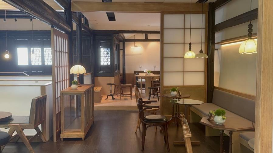 該旗艦店位于歷史文化底蘊深厚的十五奎巷,與閑吉“慢、自然、治愈”的飲茶理念相契合。店員介紹,旗艦店由民國時期古建筑改造而成,門頭白墻黛瓦配石材門框,墨綠色牌匾呼應(yīng)抹茶主題,店內(nèi)以原木色家具為主,搭配綠植、竹簾、懸掛吊燈等,營造出中式氛圍。