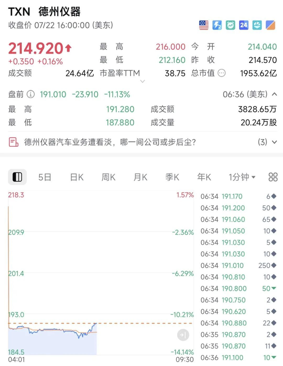 7月23日美股盤前,美國(guó)芯片巨頭德州儀器股價(jià)大幅跳水,一度暴跌超12%。