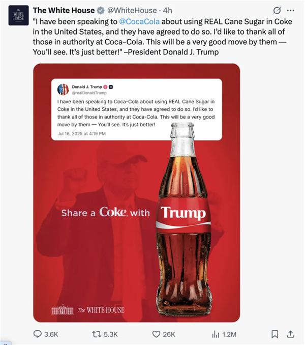 特朗普欲讓美版可樂用蔗糖,可口可樂回應(yīng)秋季將推出相關(guān)產(chǎn)品