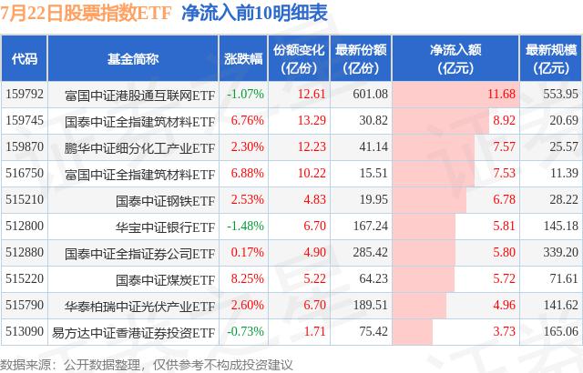 當日有234只股票指數(shù)ETF基金出現(xiàn)資金凈流入,其中凈流入排名首位的是富國中證港股通互聯(lián)網ETF(159792),份額增加了12.61億份,凈流入額為11.68億元。