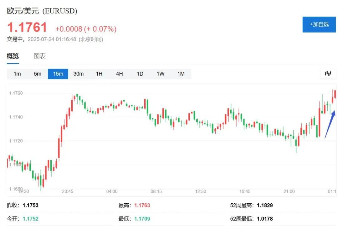 周三臨近美股午盤時(shí),上述歐美協(xié)議的消息傳出,隨即引發(fā)市場反應(yīng)。歐元兌美元匯率短線拉升,不僅抹平日內(nèi)跌幅,還小幅轉(zhuǎn)漲。美股午盤時(shí)漲幅進(jìn)一步擴(kuò)大,歐元兌美元匯率漲破1.1760,刷新7月8日以來的高位。