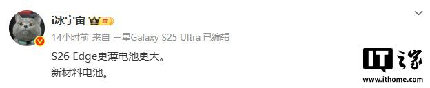 IT之家7月24日消息,三星史上最薄手機(jī)Galaxy S25 Edge于今年5月發(fā)布,國(guó)行版售價(jià)7999元起。據(jù)博主@i冰宇宙昨日爆料,三星Galaxy S26 Edge機(jī)身會(huì)更薄,電池更大,還配備了新材料電池。