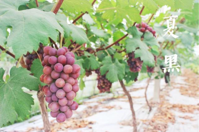 “夏黑”7 月中旬上市,果皮厚而脆,果肉硬脆飽滿,無肉囊,果汁紫紅色,有濃郁草莓香味。