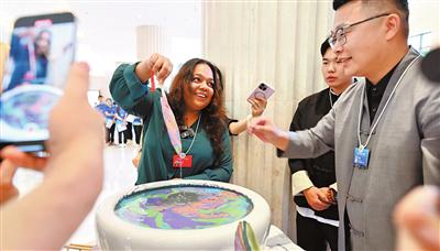 天津鄭氏漆器的展臺前人來人往。北京大學國際關系學院在讀博士、俄羅斯留學生羅維衛(wèi)現(xiàn)場體驗了漂流漆畫扇的制作。他說:“漆液在水面流動的軌跡就像絲綢一樣柔美?!彼p輕撥動水面上的彩漆,漆液在水中舒展、變換色彩。隨后,他將團扇緩緩浸入,快速抽出,一幅獨一無二的漆畫便出現(xiàn)在扇面。他興奮地說:“每一把扇子都是不可復制的藝術品,正如每個文明都有自己獨特的魅力。這項來自天津的非遺技藝,讓我們感受到了天津海納百川的包容氣質?!?/p>
