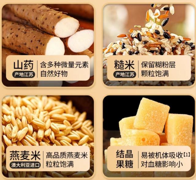 黑藜麥:含有B族維生素以及鐵、鈣、鉀、鋅等多種礦物質(zhì),還有人體必需的9種氨基酸,堪稱“人體營養(yǎng)倉庫”。此外,還加入了山藥、糙米、燕麥米、結(jié)晶果糖,配方科學營養(yǎng)。