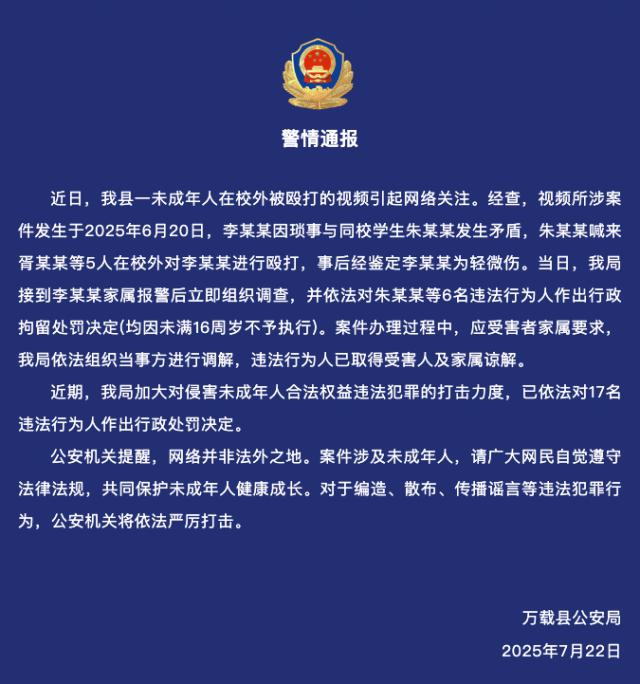 社會事件中,近日,江西省萬載縣一未成年人在校外被毆打的視頻引起網(wǎng)絡關注。7月22日晚,萬載縣公安局發(fā)布警情通報稱,被毆打未成年人李某某經(jīng)鑒定為輕微傷,公安機關依法對朱某某等6名違法行為人作出行政拘留處罰決定(均因未滿16周歲不予執(zhí)行)。