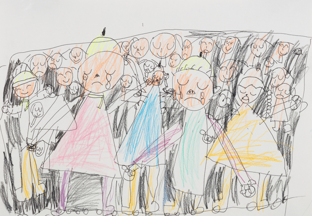 5歲的劉梓晴小朋友的《公交車上的人》,生動(dòng)地表現(xiàn)出了擁擠車廂里人們尷尬沮喪的表情。