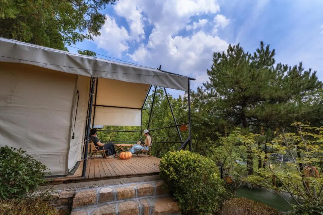 紅葉谷帳篷酒店坐落于群山翠綠之中,七座精心打造的露營帳篷,分別名為絢秋、流箋、陶然、天趣、圣水、嚶鳴、萬葉,每一處都以其獨特的自然景觀命名,旨在為游客提供與自然風(fēng)光完美融合的駐留體驗。