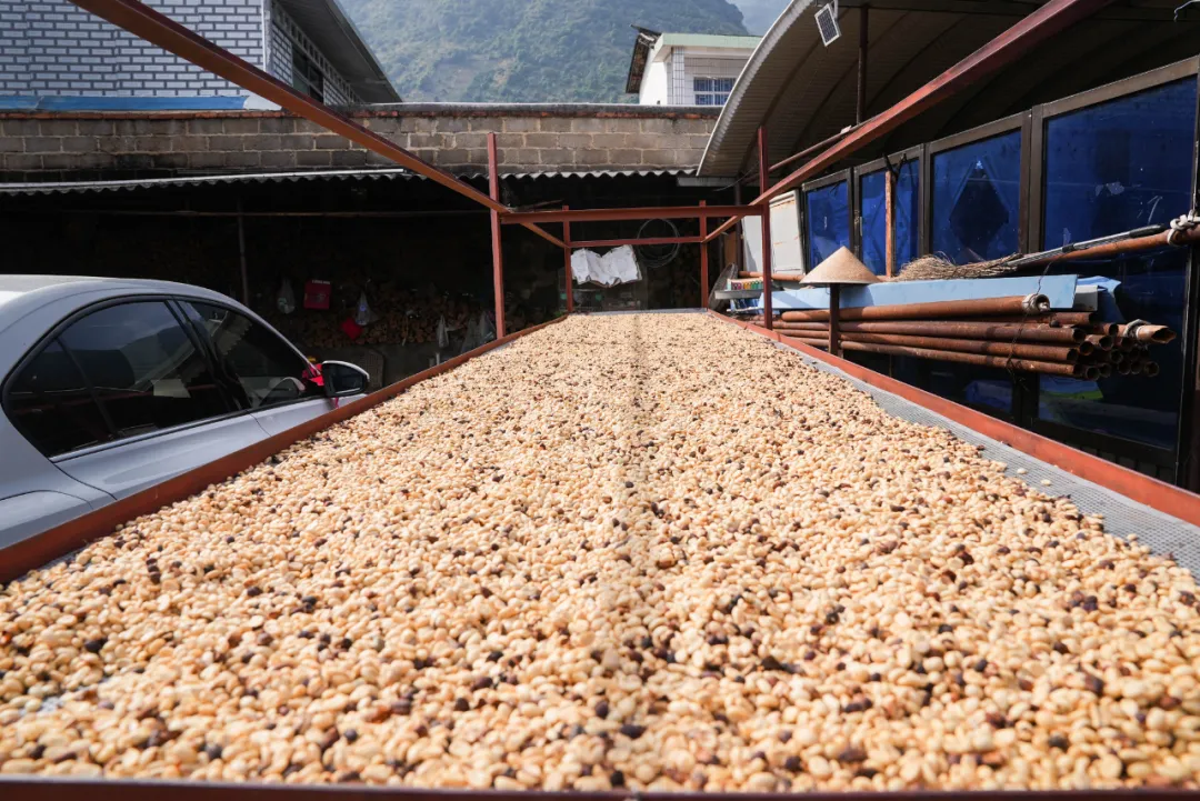 晾曬咖啡豆。