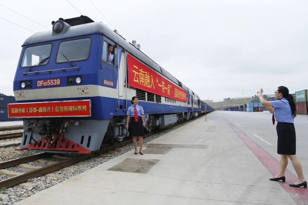 中歐集裝箱國際班列從呈貢王家營開行,集裝箱裝載著云南特產咖啡。