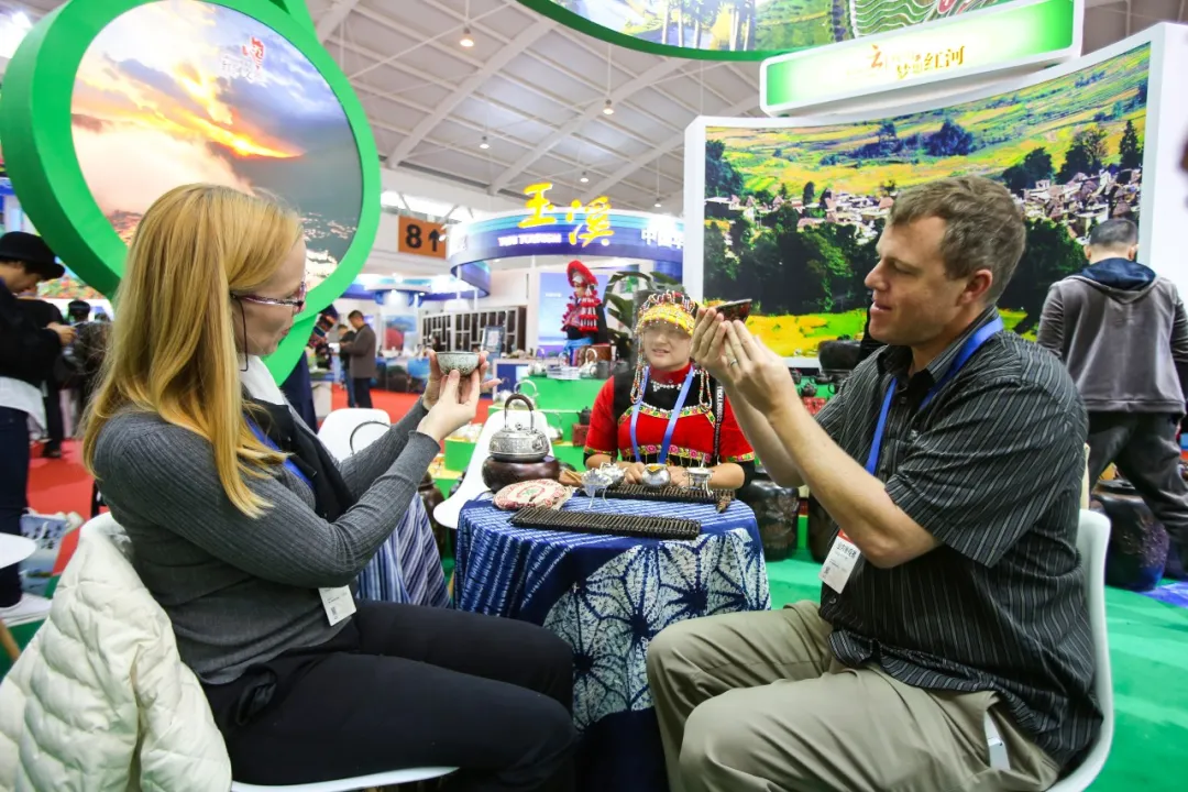 中國國際旅游交易會上,外國朋友正在品嘗茶水。