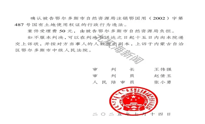 法庭,判決鄂爾多斯自然資源局違法