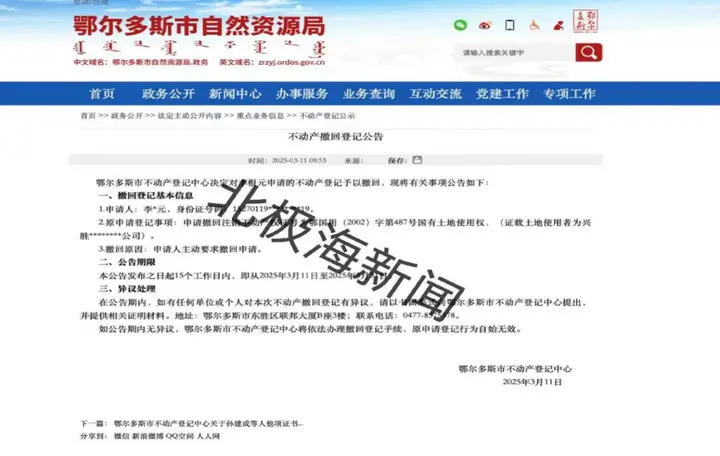 (圖為鄂爾多斯市自然資源局不動產(chǎn)撤回公告)