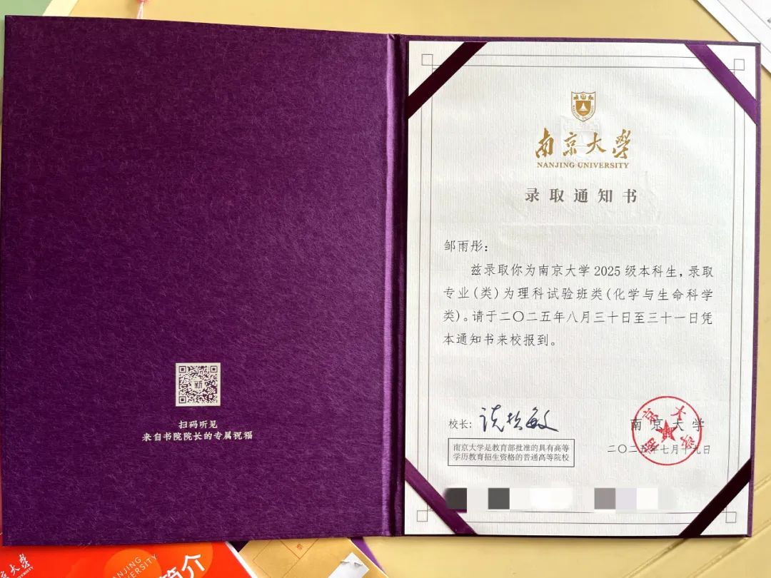 7月22日下午,一個印著南京大學(xué)?;盏腅MS特快專遞,送到了溧水區(qū)永陽街道鄒榮成家中,他的女兒鄒雨彤被南京大學(xué)錄取了。