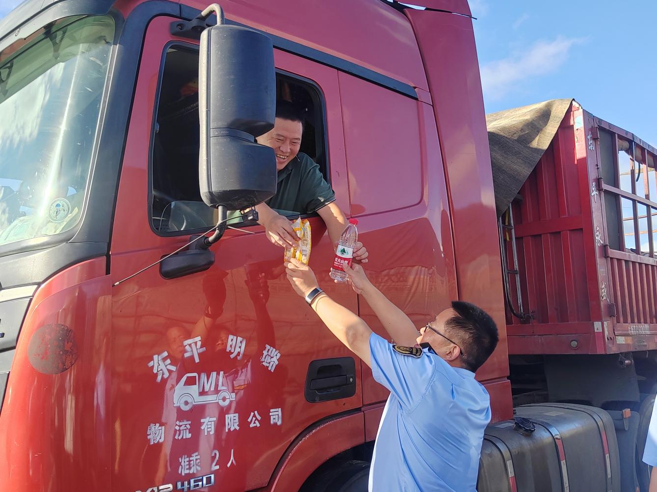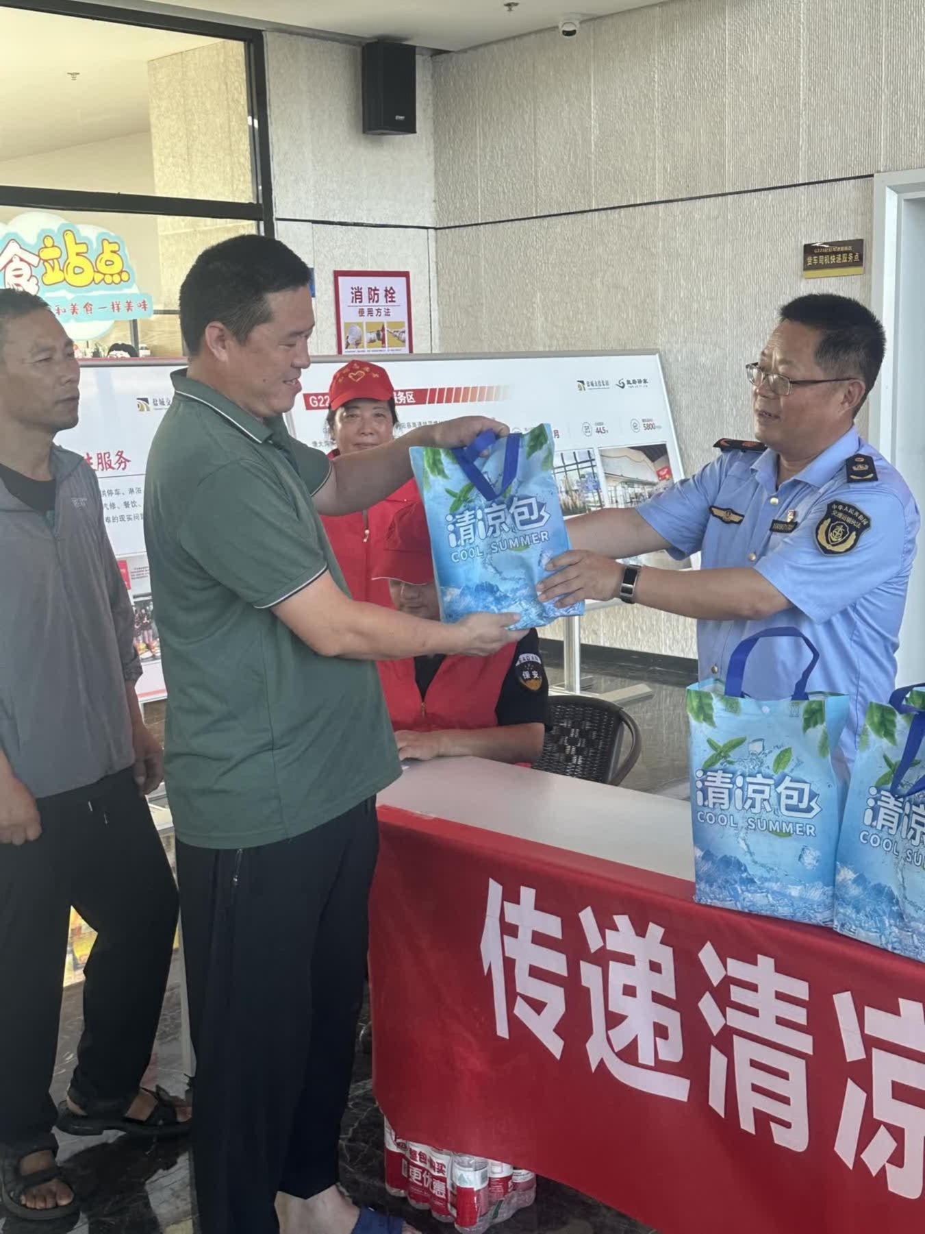 與此同時(shí),戶外黨日活動(dòng)也同步進(jìn)行。黨員干部們化身“送清涼使者”,走出服務(wù)區(qū)大廳,主動(dòng)到??康呢涇嚺院驼谛菹⒌乃緳C(jī)師傅身邊,為他們送上冰棍和礦泉水。交通局工作人員每到一處,都會(huì)和司機(jī)師傅親切交流,一邊遞上清涼物資,一邊反復(fù)提醒他們?cè)诟邷靥鞖庖龊梅朗罘罆瘢鳂I(yè)間隙找陰涼處休息,行車時(shí)集中精神,注意安全。這些暖心的提醒就像夏日清風(fēng),撫慰了司機(jī)們的辛勞,驅(qū)散了高溫帶來的煩躁,讓他們感受到黨組織的關(guān)懷和溫暖。