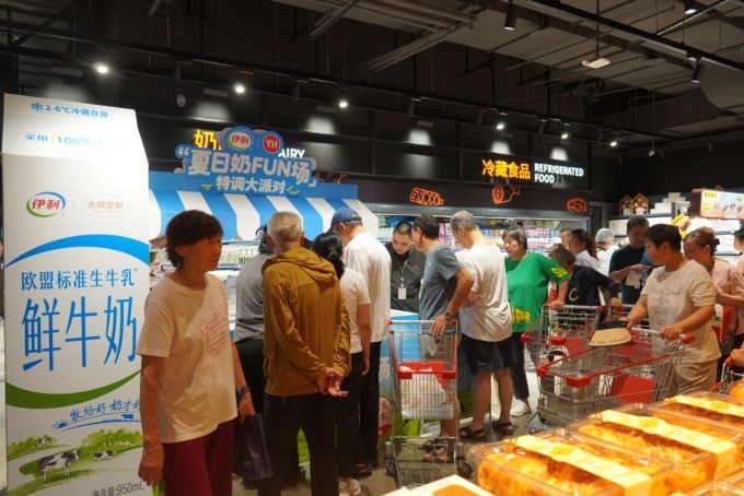 特色專區(qū)融合了地方文化和高品質(zhì)商品,“滬上風(fēng)物”專區(qū)集中展示大白兔奶糖、本地糕點(diǎn)等上海經(jīng)典伴手禮;胖東來(lái)自有品牌專區(qū)引入了DL礦泉水、精釀啤酒、燕麥脆等暢銷單品;永輝自有品牌專區(qū)涵蓋了醬香白酒、精釀啤酒、黑松露餅干等生活必需品。其中,永輝近期推出的定制新品——伊利高品質(zhì)鮮牛奶(950ml),以7.9元的親民價(jià)格迅速受到歡迎。這款家庭裝鮮奶選用GAP一級(jí)認(rèn)證牧場(chǎng)的奶源,每100ml含有3.2g優(yōu)質(zhì)乳蛋白,體細(xì)胞及菌落數(shù)比歐盟標(biāo)準(zhǔn)更嚴(yán)格,采用專利屋頂鎖鮮包裝,冷藏保質(zhì)期為15天,是永輝“優(yōu)質(zhì)平價(jià)”戰(zhàn)略的典型代表。