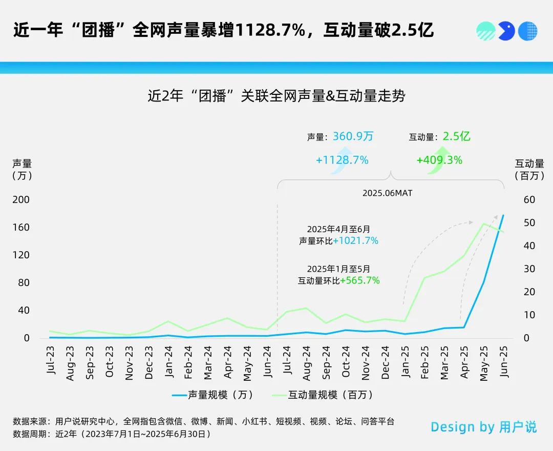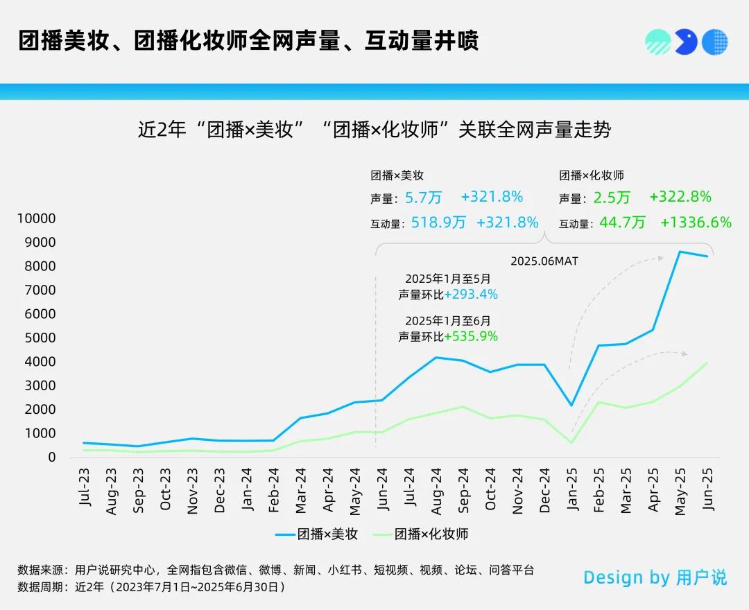 這些創(chuàng)新嘗試迅速點(diǎn)燃了市場的熱情。用戶說研究中心的數(shù)據(jù)顯示,“團(tuán)播X美妝”話題在近兩年的熱度大幅上升。在2025.6MAT統(tǒng)計(jì)周期內(nèi),相關(guān)內(nèi)容的互動(dòng)量達(dá)到了518.9萬次,同比增長321.8%。