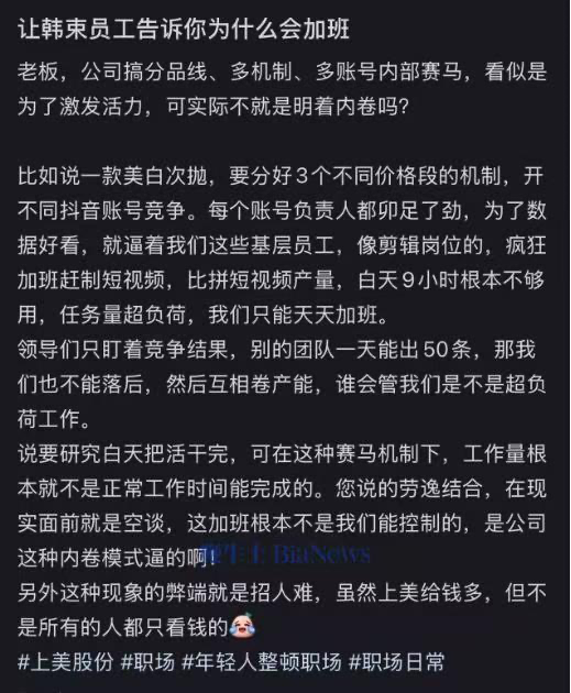一位韓束前員工發(fā)文稱,一款美白次拋要分3個不同價格段,開不同抖音賬號競爭。各賬號負(fù)責(zé)人為了數(shù)據(jù)好看,逼迫基層員工如剪輯崗位的瘋狂加班趕制短視頻,比拼產(chǎn)量。白天9小時根本不夠,任務(wù)量超負(fù)荷,只能天天加班。領(lǐng)導(dǎo)只看競爭結(jié)果,不管員工是否超負(fù)荷工作。