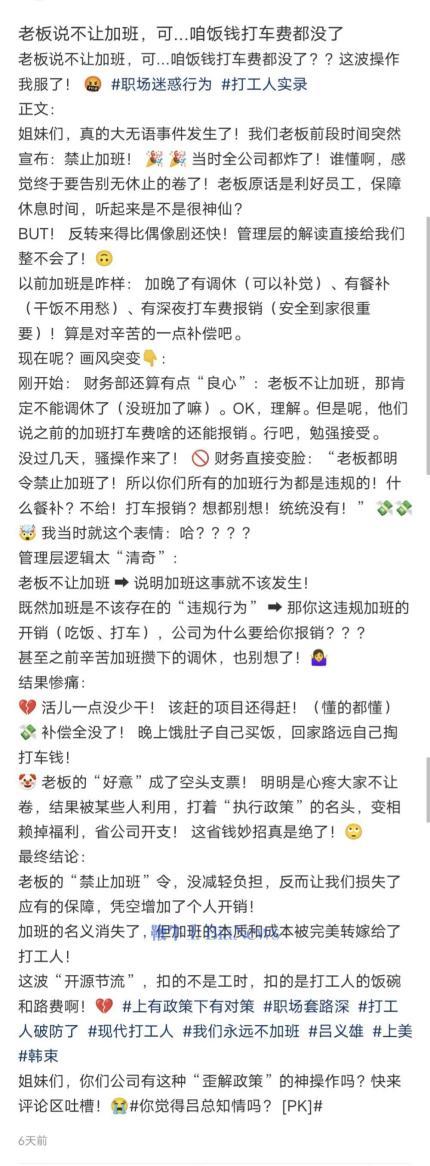 1、韓束創(chuàng)始人高調(diào)“反加班”卻遭員工質(zhì)疑,公司的賽馬機(jī)制使工作量未減,還有員工稱原有加班餐補(bǔ)被取消。