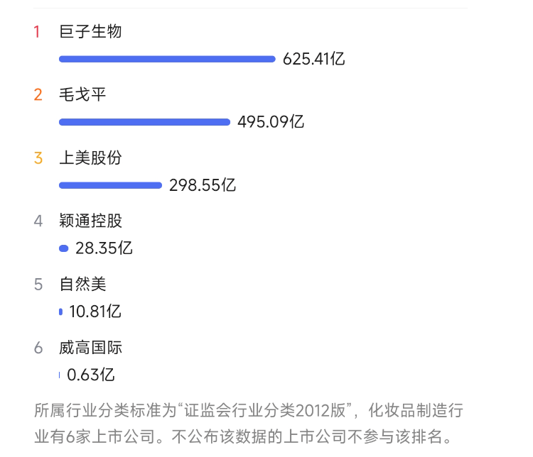 從資本市場表現(xiàn)看,與同行業(yè)對比,巨子生物當(dāng)前市值約620多億港元(7月23日收盤數(shù)據(jù)),毛戈平市值約490多億港元,而上美股份市值約290多億港元。