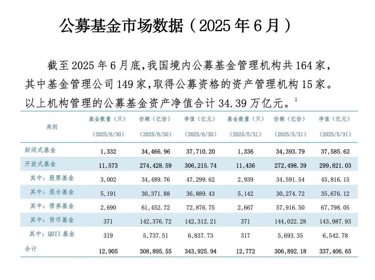 中基協(xié)發(fā)布的最新公募基金市場數(shù)據(jù)顯示,6月底,我國公募基金總規(guī)模達(dá)到34.39萬億元,這是自2024年初以來第九次創(chuàng)下歷史新高。