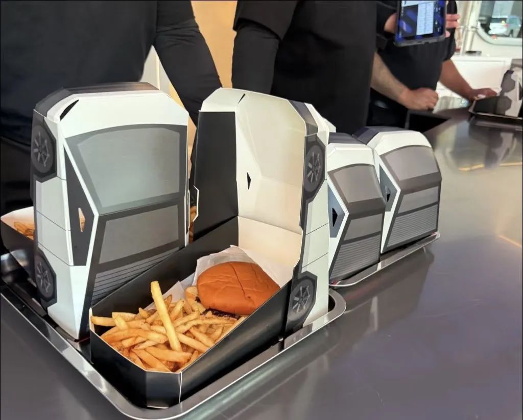 他們可以通過(guò)車(chē)載屏幕一鍵點(diǎn)餐,菜單由洛杉磯本地名廚Eric Greenspan設(shè)計(jì),雖以漢堡、薯?xiàng)l等經(jīng)典美式快餐為主,但頗具特色。