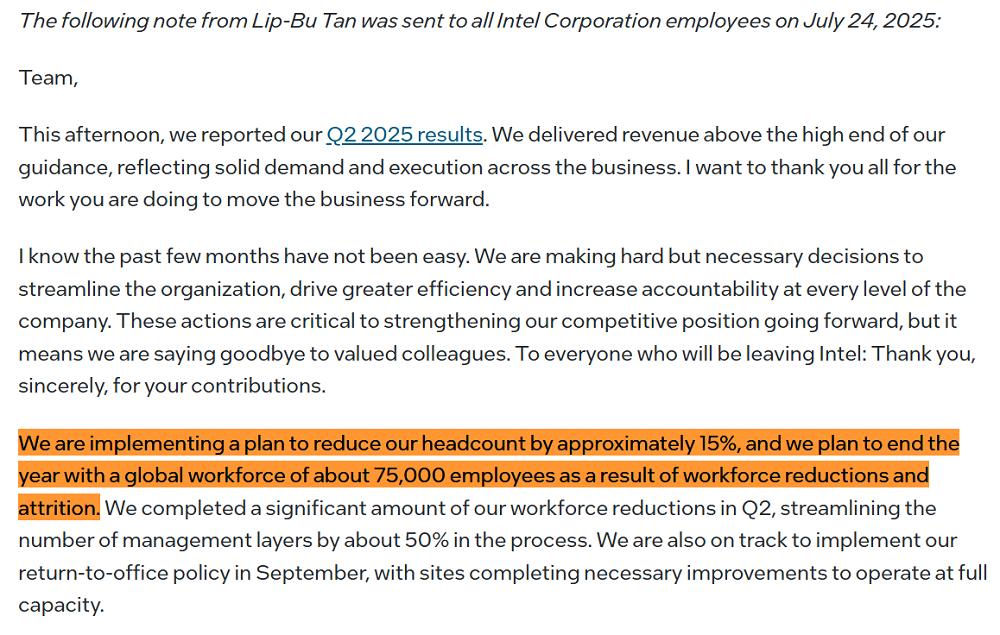 此次裁員計劃恰逢英特爾2025年第二季度業(yè)績發(fā)布。該季度,英特爾營收129億美元,超出市場預期,但虧損29億美元。