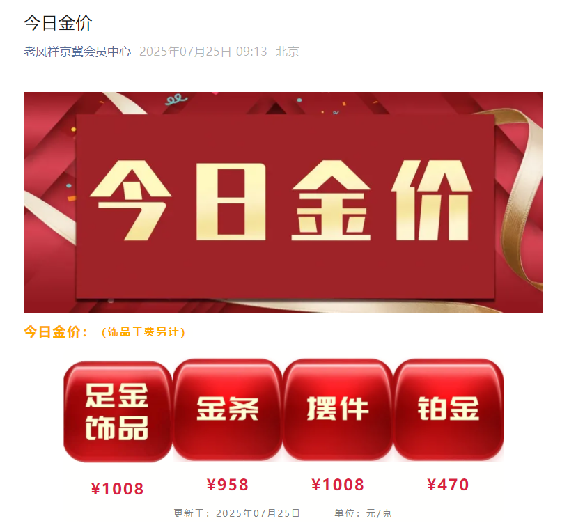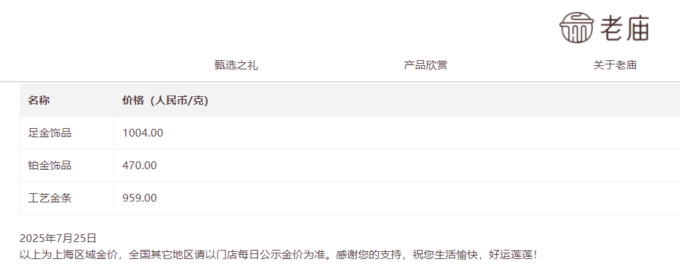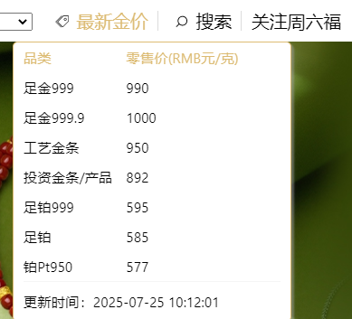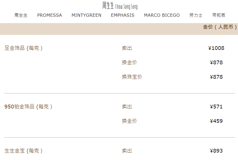 中新經(jīng)緯查詢得知,受國際金價下跌影響,25日國內(nèi)金飾價格普遍下跌,單克價格紛紛跌至千元左右。其中,老廟黃金為1004元,相比兩天前跌了19元;周生生金飾價格為1008元,兩天內(nèi)跌了21元;老鳳祥為1008元/克,2天跌了16元;周大福足金價格為1010元/克,2天跌了13元;周六福足金999價格為990元/克,2天跌13元,足金999.9為1000元/克。