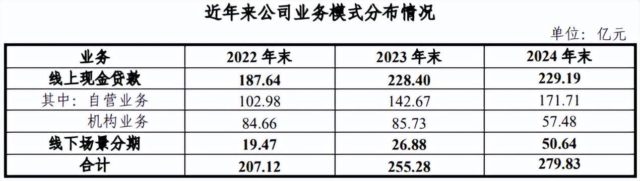 業(yè)務(wù)結(jié)構(gòu)上,雖為產(chǎn)融類消金公司,早期專注家電分期業(yè)務(wù),但近年現(xiàn)金貸業(yè)務(wù)成主要收入來源。截至2024年末,現(xiàn)金貸業(yè)務(wù)規(guī)模222.19億元,占比81.9%,2022年末占比曾超90%。