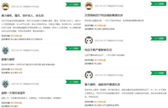 在黑貓投訴平臺,海爾消金投訴累計超1.3萬條,近30天投訴量為268條。投訴中“暴力催收”字眼較多,包括持續(xù)發(fā)短信和打電話、通訊錄轟炸、騷擾親友等。