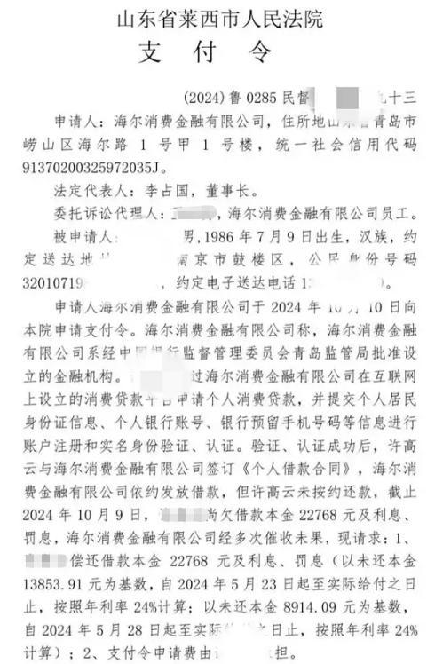 海爾消金起訴后會申請“支付令”,借款者15天內(nèi)不理會,支付令落實,起訴方可申請強(qiáng)制執(zhí)行。借款者對支付令有異議,可書面申請并郵寄至受理法院。