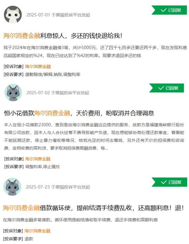 還有消費(fèi)者稱,2024年在海爾消金借款3筆共5000元,還了4700多元,還要還2000多元,利率超國家規(guī)定的24%上限。