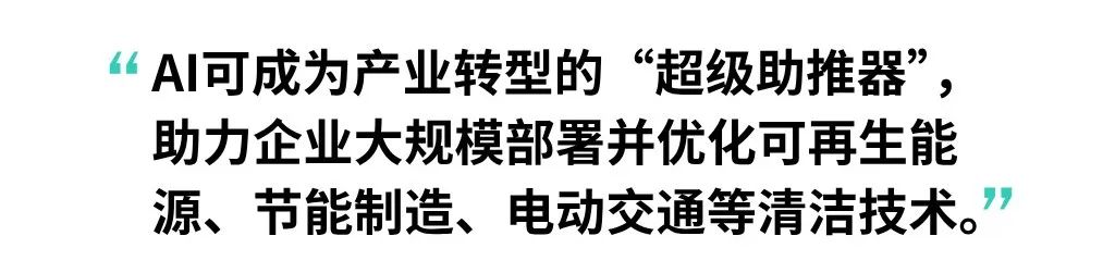 AI可成為產(chǎn)業(yè)轉(zhuǎn)型的“超級助推器”,助力企業(yè)大規(guī)模部署并優(yōu)化可再生能源、節(jié)能制造、電動交通等清潔技術(shù)。