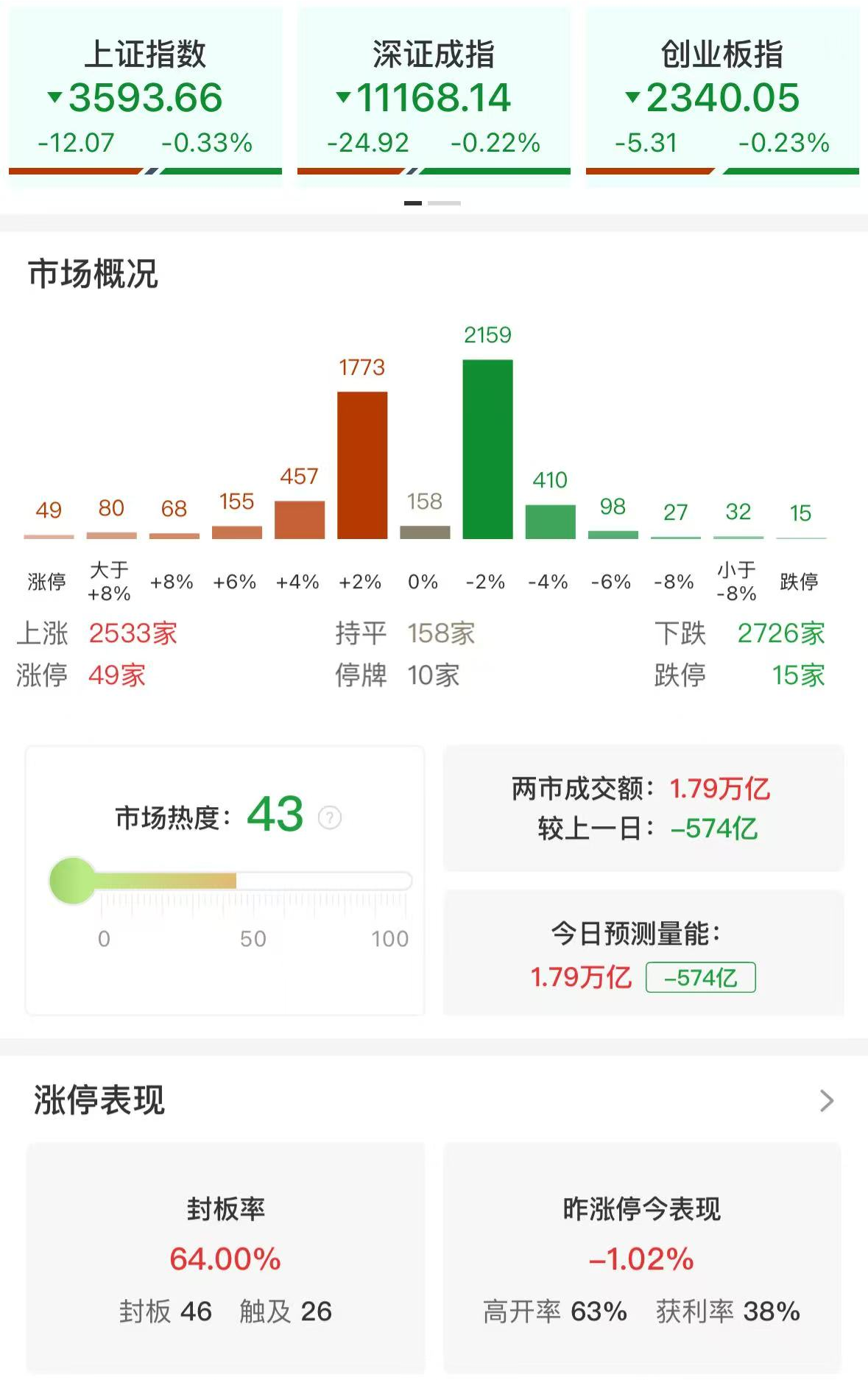 滬深兩市全天的成交額為1.79萬(wàn)億,和上個(gè)交易日相比縮量574億。收盤(pán)時(shí),滬指下跌0.33%,深成指下跌0.22%,創(chuàng)業(yè)板指下跌0.23%。