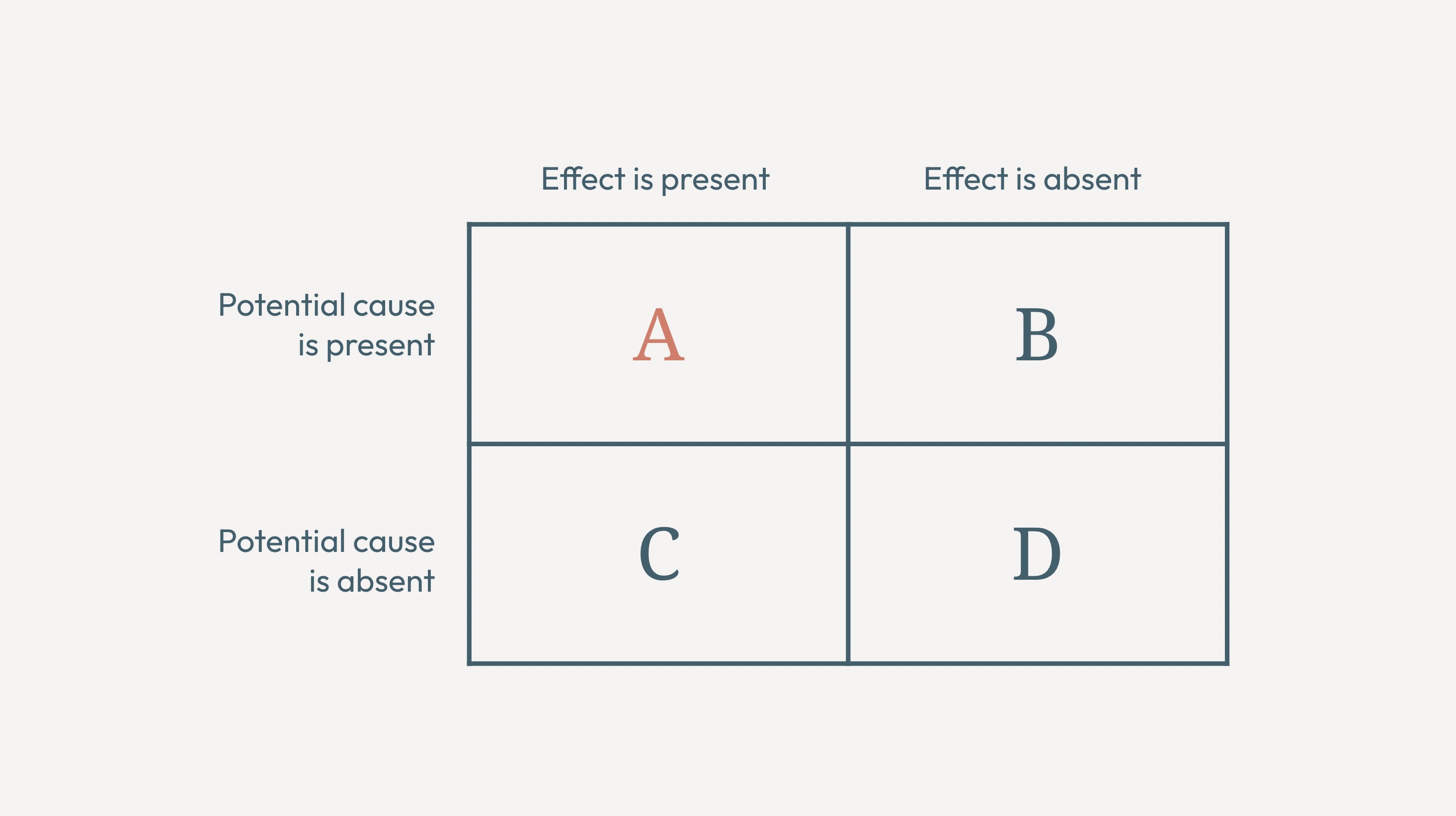 什么時(shí)候我們最容易陷入虛假相關(guān)性呢?可以借用統(tǒng)計(jì)學(xué)的列聯(lián)表來(lái)識(shí)別。下面的矩陣我借用自一篇關(guān)于因果錯(cuò)覺(jué)的研究論文,因果錯(cuò)覺(jué)和虛假相關(guān)性類(lèi)似,還進(jìn)一步假設(shè)了因果關(guān)系。