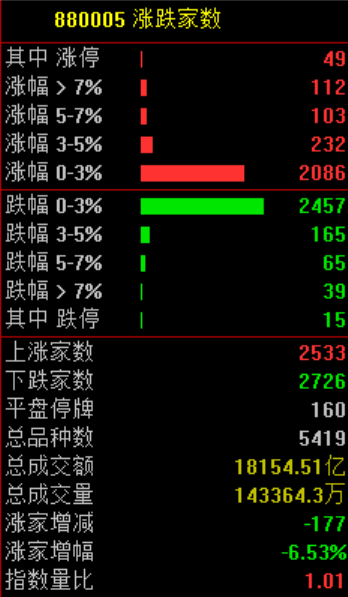 市場中共有2533只個股上漲,49只個股漲停,2726只個股下跌。